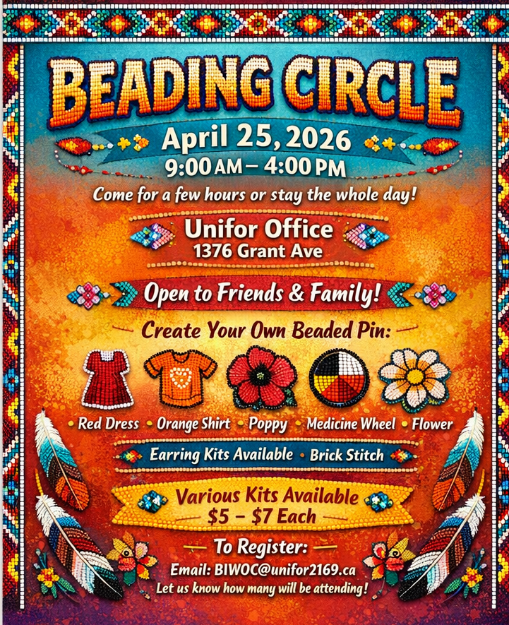 This is Local 2169’s second beading event. Open to friends and family and geared more towards beginners but seasoned beaders are welcome as well. We will have an interpreter onsite from 10am-noon and we will begin instruction at the start of each hour for those coming part way through the day. Please post the attached poster to your union board and circulate with family and friends.